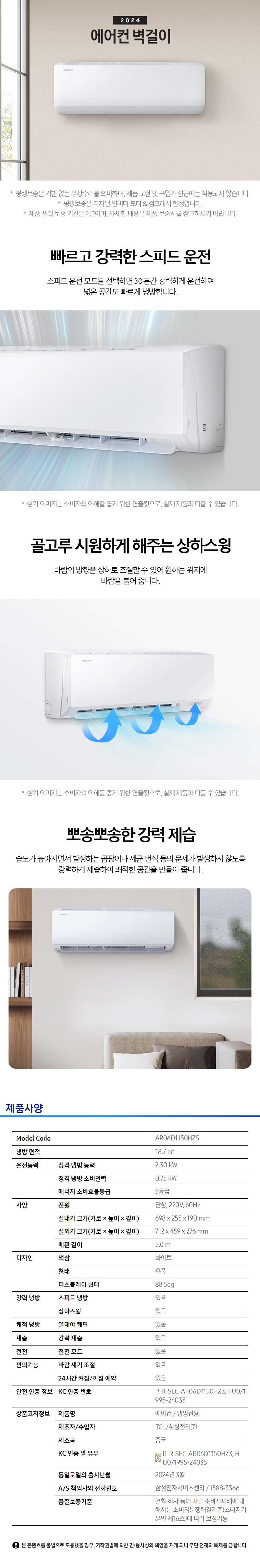 • [삼성] [헬로렌탈 빠른설치]삼성 에어컨 벽걸이형 18.7㎡ AR06D1150HZS